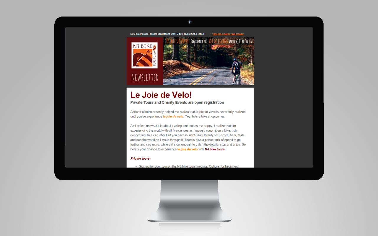 Jake had everything going wonderfully. He was getting loads of traffic to his web site and was confident in his brand and in his new, exciting business venture. I decided that it'd be ideal to capture all that traffic, so we set up some "sign up" forms on his website in exchange for a small discount on a first ride. NJ Bike Tours got sorted with a beautiful email template that can easily be updated when there's a new campaign.